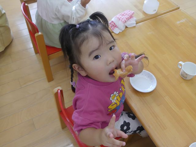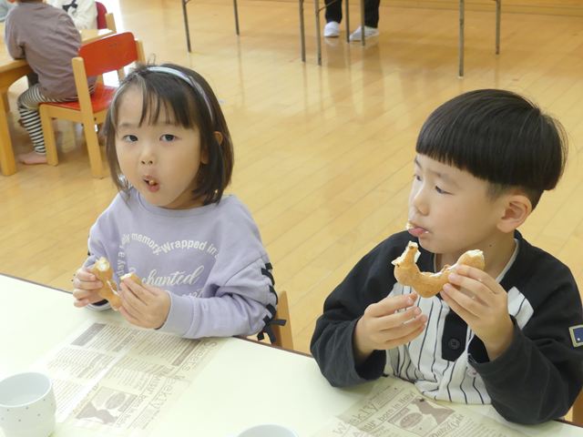 きりん組がすくすく農園で育てたカボチャを使って『かぼちゃのおやき』を作りました。まずは蒸かしたかぼちゃをつぶして、生地を作りました。かぼちゃをつぶすのも、生地を混ぜるのも、なかなかの力仕事…力いっぱい頑張りました。次はホットプレートで焼いていきます!「わ〜いいにおいしてきた!」「色が変わったよ!」と大はしゃぎ!フライ返しでおやきを裏返すのはちょっと難しかったけど、美味しいおやきが焼きあがり、みんな2枚をぺろりと完食していました。お家でもお母さんと一緒に作ってみてね!