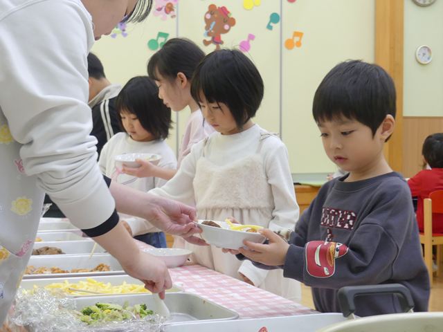 そして、今日は給食もお楽しみ!ビュッフェスタイルの給食です。苦手なものは少なめに…大好きなものは大盛りで!お代わりも自由です。みんなたくさん食べていました。楽しい楽しい1日となりました。