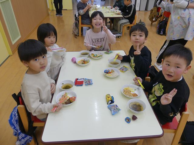 お別れ会では、こども園での思い出を振り返ったり、将来の夢を発表したりと、楽しい会となりましたが、同時に淋しい気持ちも湧いてきました。きりん組さんと一緒に給食を食べれるのもあと何回かな…?