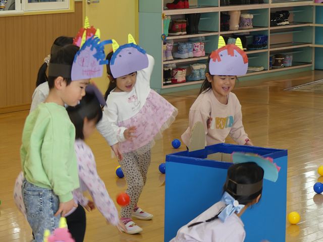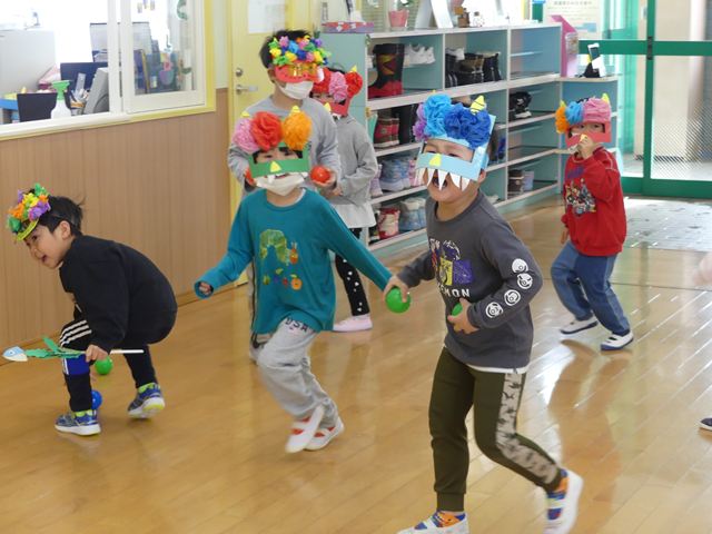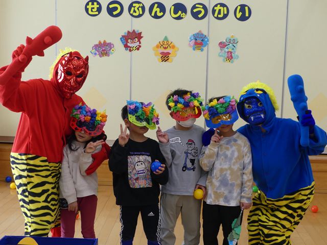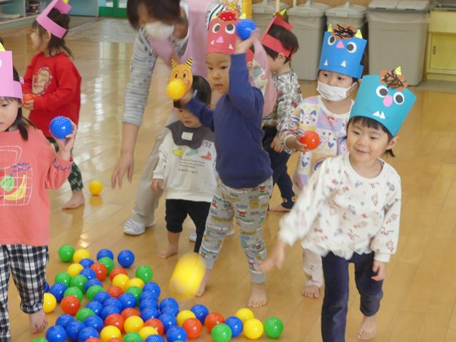 赤鬼と青鬼が登場すると会場は騒然…「鬼は外!福は内!」の掛け声も忘れ、ただただ逃げ回る子どもたちでした。泣きながらも勇気を出し、カラーボールを投げつけて鬼を何とか撃退!頑張って退治することができました。笑って、泣いての鬼退治も、きっと子どもたちの成長につながったと思います。