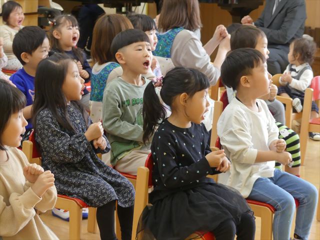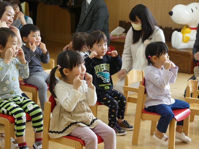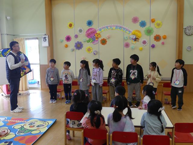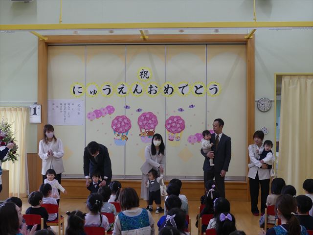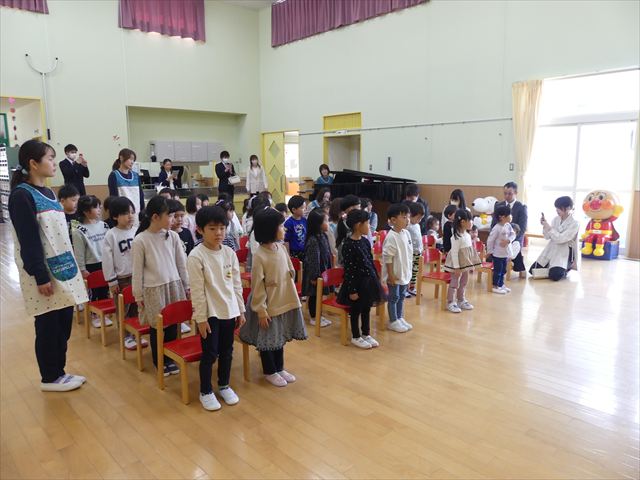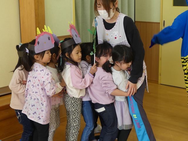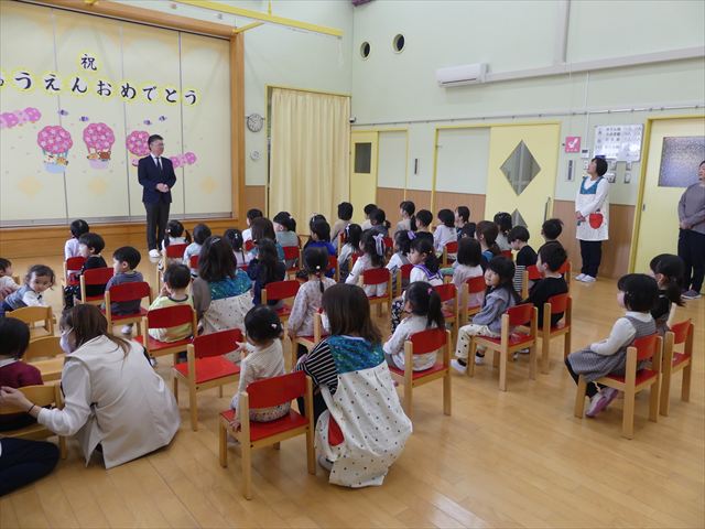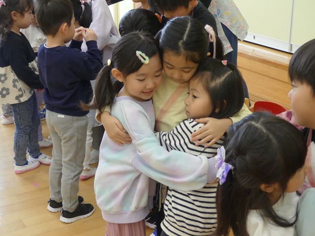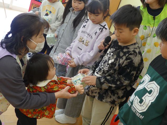 今年度もあと少しとなりました。年長児として頑張ってきた、きりん組さんとのお別れ会を行いました。たくさん遊んでくれた、大好きなきりん組さんに、各クラスと園長先生からプレゼントが贈呈されました。きりん組さんもお礼のハグで感謝を伝えていました。