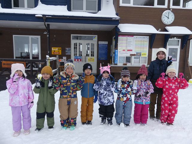 9日、相馬ロマントピアスキー場へスキー、そり遠足に行ってきました。あいにくのお天気でしたが、たっぷりの雪、広いスキー場でスキーやそり遊びを楽しみました。きりん組は、スキーで長いスロープに挑戦!園庭でたくさん練習した成果があり、上手に滑っていました。