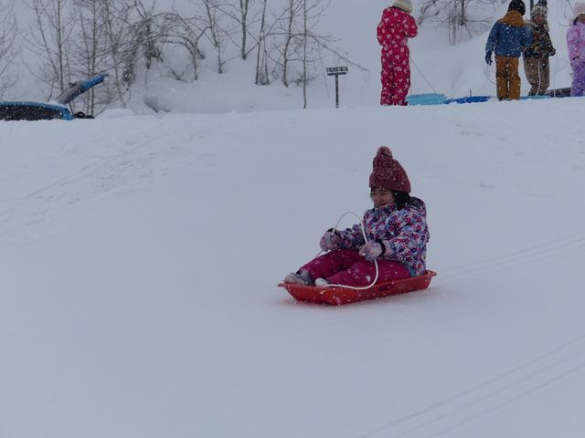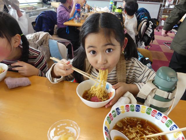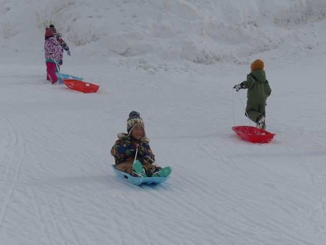 うさぎ組は何度も何度も坂を駆け上がってそり遊びを楽しみました。一人で乗ったり、友達と乗ったり…広いスキー場は爽快感が違いました。たくさん遊んだ後は、あったかいラーメンをいただきました。とっても美味しかったです!