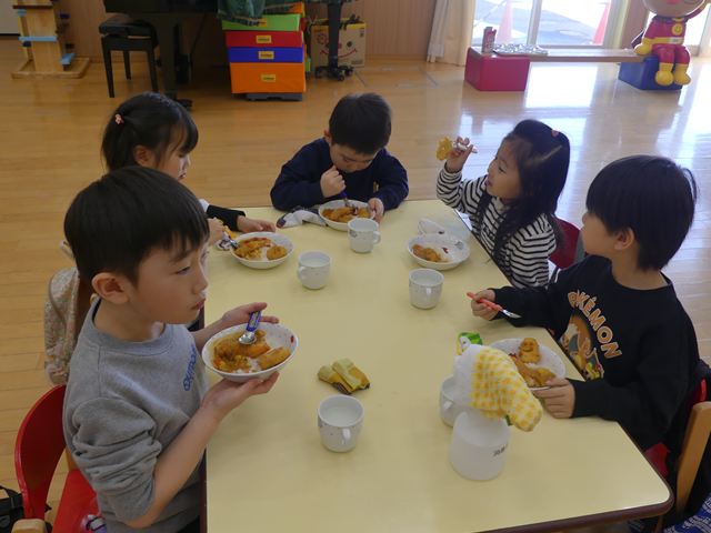 今月5日、年長児が竹館小学校に給食体験に行ってきました。ランチルームで、4年生、5年生、6年生と一緒に給食を食べました。いつもはおしゃべりなきりん組さんですが、小学校では、お兄さんお姉さんに習って、静かに黙々と給食を食べていました。ほとんどの子が完食することができ、また一つ自信につながりました。春になるのが楽しみですね!